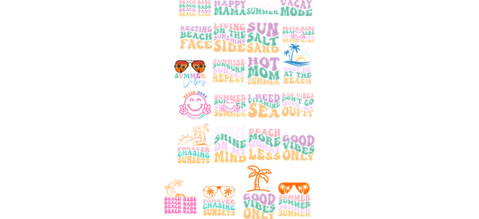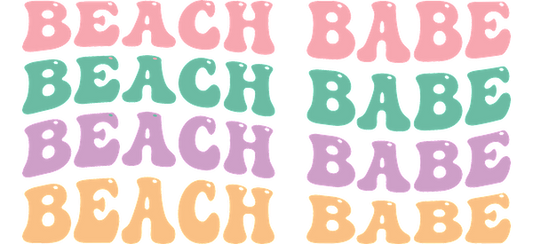 Colorful "Beach Babe" text design featuring playful fonts in pastel shades, perfect for summer vibes and beach-themed decor.UV Transfers dtf transfers