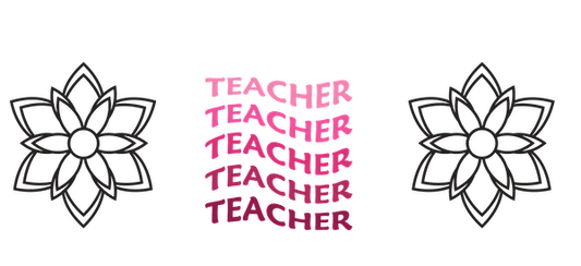 A vibrant design featuring the word "TEACHER" in pink with floral elements on both sides, celebrating educators.UV Transfers heat press transfers