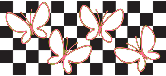 A whimsical design featuring four colorful butterflies outlined in vibrant pink against a transparent background.UV Transfers dtf prints