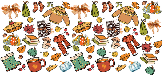 A delightful autumn-themed illustration featuring cozy sweaters, raccoons, pumpkins, leaves, and warm mugs, capturing the essence of fall.UV Transfersdtf regular iron