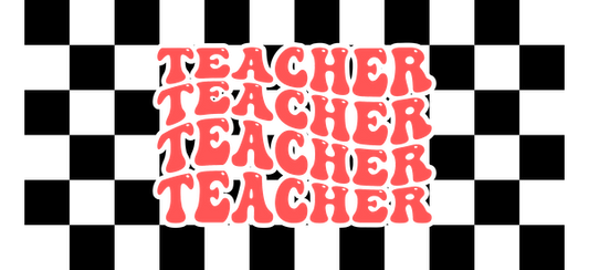 A bold graphic design featuring the word "TEACHER" repeated in playful, retro-style lettering.UV Transfers dtf transfers