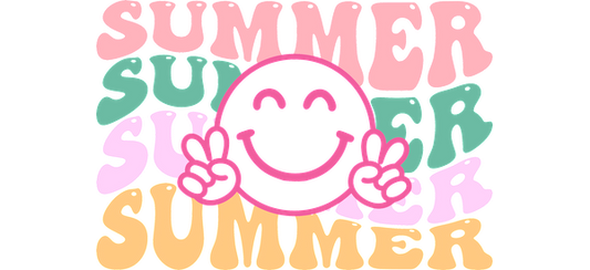 Colorful "SUMMER" text layered with a happy smiley face making peace signs, perfect for capturing the fun vibe of the season!UV Transfers dtf prints