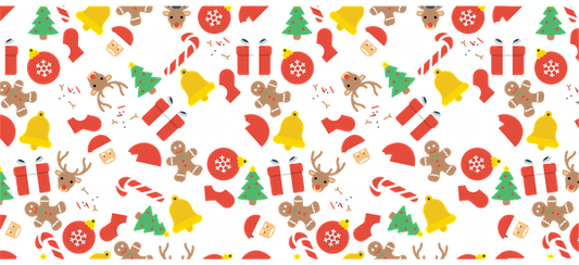 A festive pattern featuring Santa hats, Christmas trees, gifts, candy canes, and gingerbread cookies, perfect for holiday cheer!UV Transfers dtf transfers