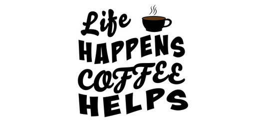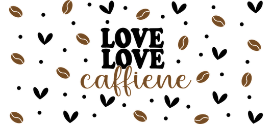 A stylish coffee-themed graphic featuring the playful word "caffeine" surrounded by scattered coffee beans, perfect for coffee lovers.UV Transfersdtf regular iron