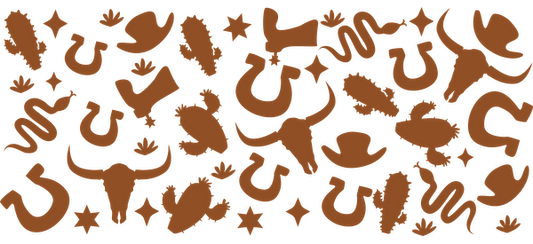 A playful array of Western-themed icons, including cacti, cow skulls, and stars in warm brown tones.UV Transfers dtf transfers