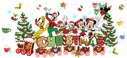 Celebrate the festive spirit with Mickey and friends, decked out in Santa hats, surrounded by Christmas trees and colorful decorations!UV Transfers dtf prints