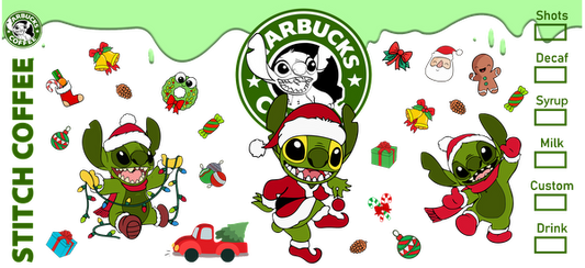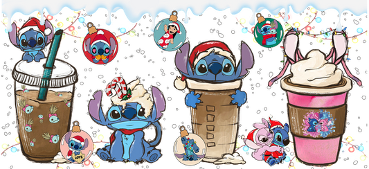 Celebrate the holidays with these adorable Stitch characters enjoying festive drinks, complete with Santa hats and playful decorations!UV Transfersdtf regular iron