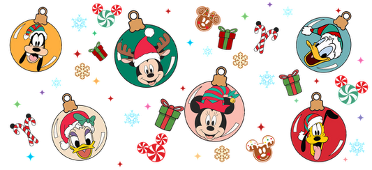 Celebrate the holidays with these festive ornaments featuring beloved Disney characters like Mickey, Minnie, Donald, and Goofy in cheerful attire!UV Transfers dtf prints
