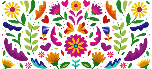 A vibrant and colorful floral pattern featuring various flowers, leaves, and hearts in playful, bold shades.UV Transfers dtf prints