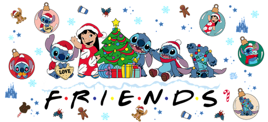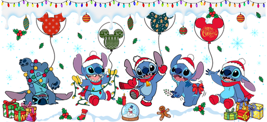 Join Stitch and friends in a festive holiday celebration, adorned with Santa hats, gifts, and colorful decorations!UV Transfers dtf prints