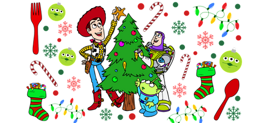 Celebrate the holidays with Woody, Buzz Lightyear, and the cute aliens, decorating a festive Christmas tree surrounded by colorful ornaments and candy canes!UV Transfers heat press transfers