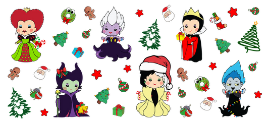 Celebrate the holidays with a fun collection of whimsical, villainous characters in festive attire surrounded by Christmas decorations!UV Transfers dtf prints