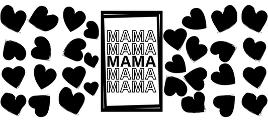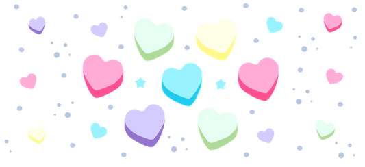 Sweet and colorful heart-shaped illustrations spread across a cheerful backdrop.UV Transfers