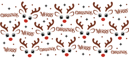 A festive pattern featuring playful reindeer faces and cheerful "Merry Christmas" text in vibrant colors, perfect for holiday decor.UV Transfers dtf transfers
