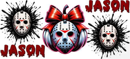 A vibrant graphic featuring Jason's iconic hockey mask adorned with a bow, surrounded by striking, edgy designs and bold text.UV Transfersdtf regular iron