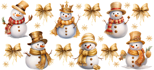 A cheerful collection of snowmen in festive hats and scarves, accompanied by golden bows and autumn leaves, perfect for holiday decor.UV Transfers dtf prints