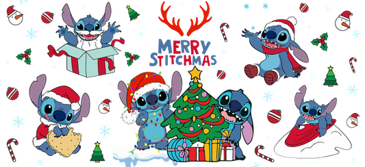Celebrate the holiday season with this cheerful "Merry Stitchmas" artwork featuring Stitch in festive scenes with gifts, a Christmas tree, and winter fun!UV Transfers dtf transfers