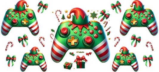 Festive holiday-themed gaming controllers in green and red, featuring candy cane stripes and playful elf hats for a cheerful vibe.UV Transfers dtf transfers