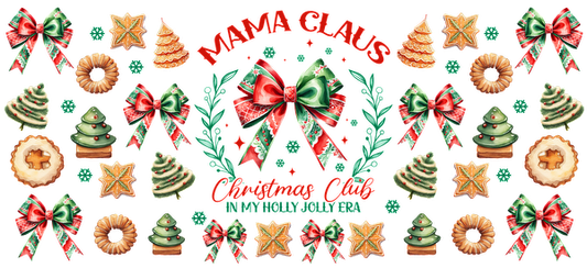 Festive illustration featuring "Mama Claus" with Christmas trees, cookies, bows, and holiday decorations for a cheerful holiday vibe.UV Transfers heat press transfers