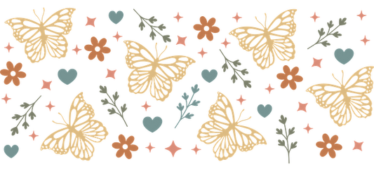 A vibrant floral pattern featuring delicate butterflies, hearts, and flowers in soft pastel colors on a dark background.UV Transfers dtf transfers