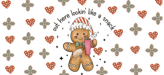 A cheerful gingerbread man in a festive hat holds a pink drink, surrounded by hearts and snowflake patterns, spreading holiday cheer!UV Transfers dtf prints