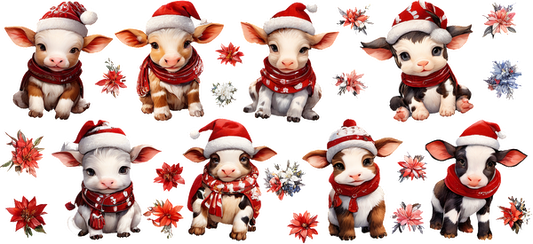 A cheerful collection of adorable calves in festive Santa hats and scarves, perfect for holiday cheer and decoration!UV Transfers dtf prints