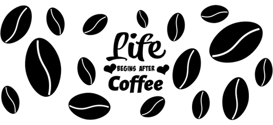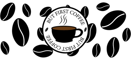 A band has "But First Coffee" on it, a coffee pot steams inside the band, and coffee beans sit around the band.UV Transfers