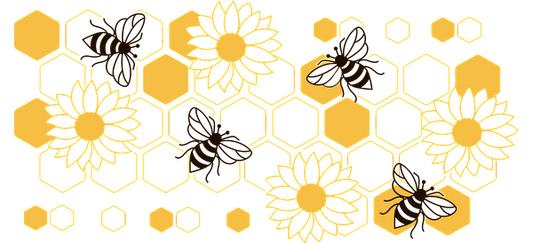 A vibrant design featuring sunflowers, honeycomb patterns, and bees in warm yellow and dark tones, celebrating nature's beauty.UV Transfers heat press transfers