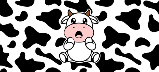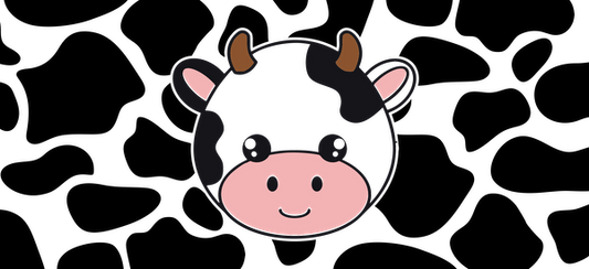 A cute, cartoon-style cow face with black and white patches, small horns, and a cheerful smile.UV Transfers heat press transfers