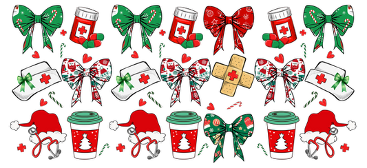 A cheerful assortment of holiday-themed medical symbols, including pills, first aid kits, festive bows, and Christmas cups.UV Transfersdtf regular iron