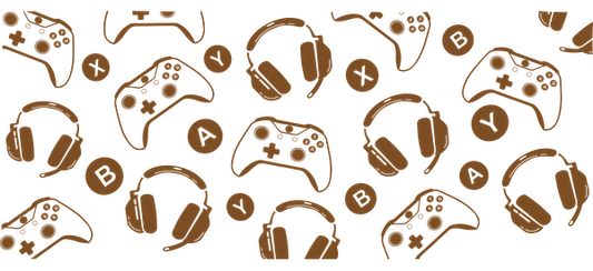 A playful pattern featuring gaming controllers and headphones, perfect for any gaming enthusiast's design or merchandise!UV Transfers heat press transfers