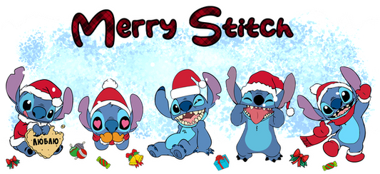 Celebrate the season with this playful "Merry Stitch" design featuring Stitch in festive Santa hats, surrounded by holiday gifts!UV Transfersdtf regular iron