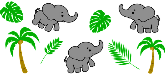 Adorable cartoon elephants playfully interacting amidst tropical greenery, including palm trees and vibrant leaves, perfect for a cheerful jungle theme.UV Transfersdtf regular iron