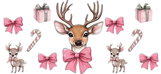 A charming illustration featuring festive deer, pink bows, candy canes, and wrapped gifts, perfect for holiday cheer.UV Transfersdtf regular iron