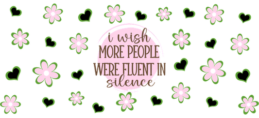 A whimsical design featuring the quote "I wish more people were fluent in silence," surrounded by pink flowers and green hearts.UV Transfers dtf transfers
