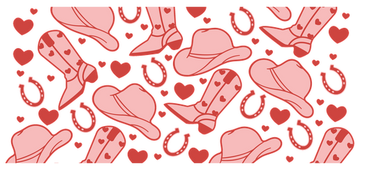 A playful pattern featuring pink cowboy hats, boots, hearts, and horseshoes, perfect for a fun, western-themed design.UV Transfers heat press transfers