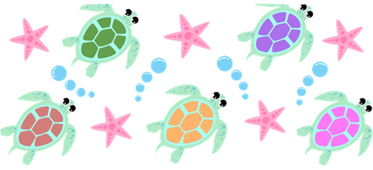 Colorful cartoon turtles swimming alongside pink starfish and bubbles create a playful and cheerful underwater scene.UV Transfers heat press transfers
