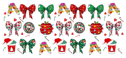 A festive collection of colorful Christmas motifs, including bows, ornaments, and holiday-themed accessories, perfect for holiday decorating.UV Transfers heat press transfers