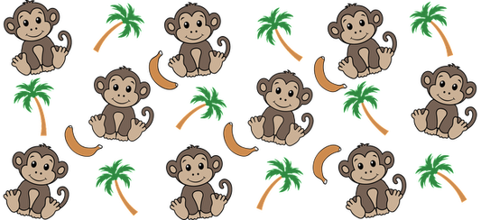 A playful and colorful pattern featuring cute cartoon monkeys, bananas, and palm trees, perfect for a fun design.UV Transfers dtf transfers