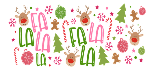 A colorful holiday-themed illustration featuring festive elements like reindeer, Christmas trees, candy canes, and cheerful "Fa La La" text.UV Transfers dtf transfers