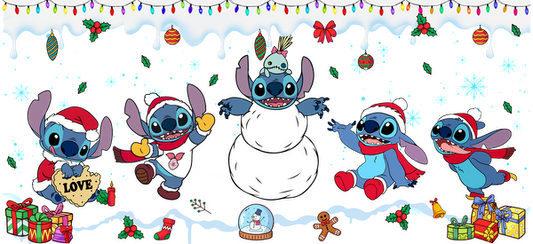 A cheerful scene featuring Stitch and friends celebrating the holidays, surrounded by gifts, decorations, and a snowy snowman.UV Transfers dtf transfers