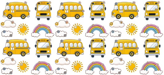 A cheerful pattern featuring colorful yellow school buses, bright suns, fluffy clouds, and vibrant rainbows for a playful touch.UV Transfersdtf regular iron