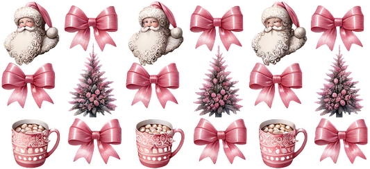 A festive collection featuring Santa, pink bows, pink Christmas trees, and mugs of hot cocoa, perfect for holiday decor.UV Transfers dtf transfers