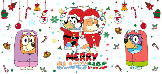 Celebrate the festive spirit with animated dog characters dressed in Christmas attire, surrounded by colorful decorations and a cheerful message!UV Transfersdtf regular iron