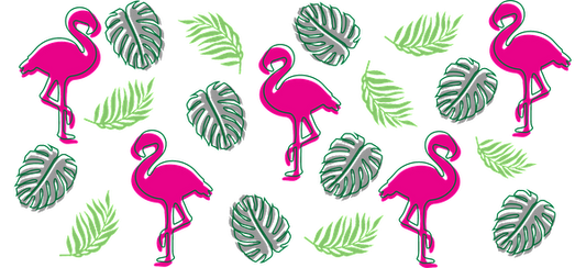 A vibrant tropical pattern featuring pink flamingos and lush green leaves, perfect for a cheerful summer vibe!UV Transfersdtf regular iron