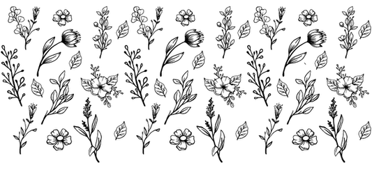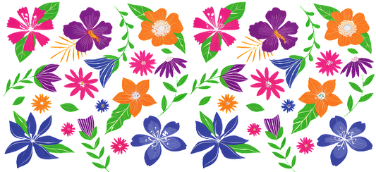 A vibrant floral pattern featuring a variety of colorful flowers and lush green leaves, perfect for spring designs.UV Transfers dtf prints