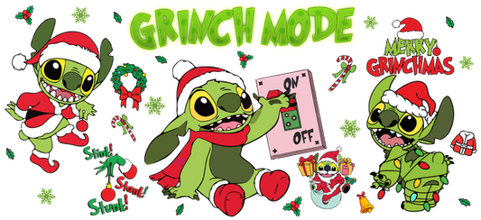 Join the festive fun with this vibrant "Grinch Mode" artwork featuring adorable, holiday-themed Stitch characters in festive attire!UV Transfersdtf regular iron