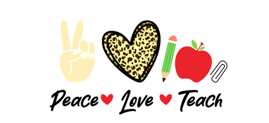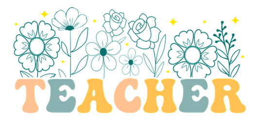 Embroidery pattern featuring the word "teacher" in blue, yellow, and green floral designs.UV Transfers