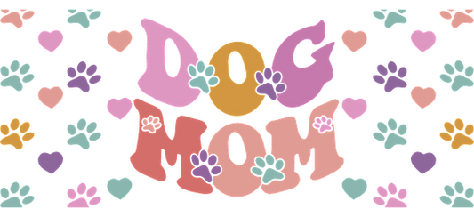 A playful and colorful design celebrating "Dog Mom," adorned with hearts and paw prints in vibrant hues.UV Transfers dtf prints