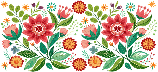 A vibrant floral pattern featuring bold red flowers, assorted colorful blooms, and lush greenery in a symmetrical design.UV Transfers dtf prints